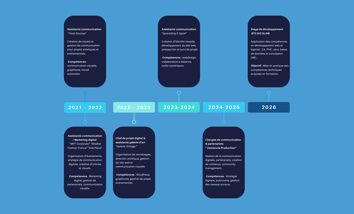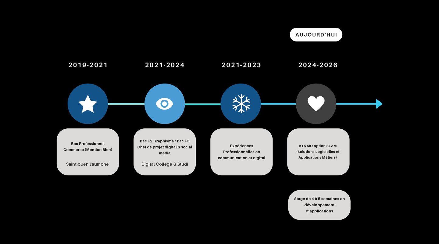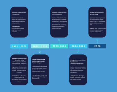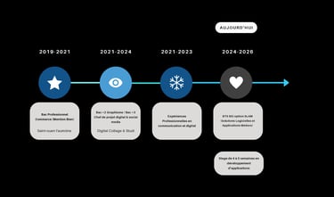 Depuis mes débuts dans le domaine de la communication digitale jusqu'à ma spécialisation en développement logiciel.