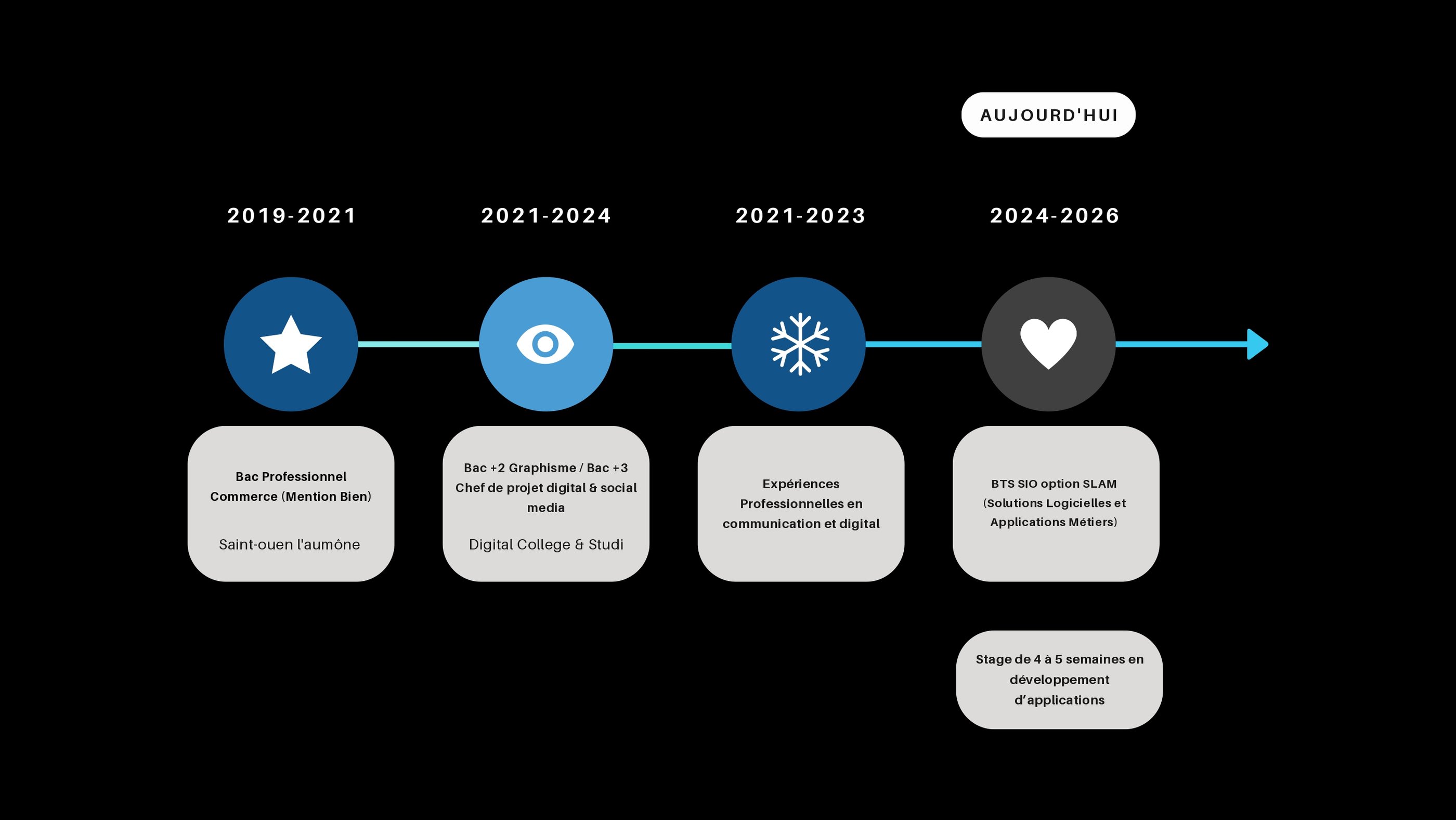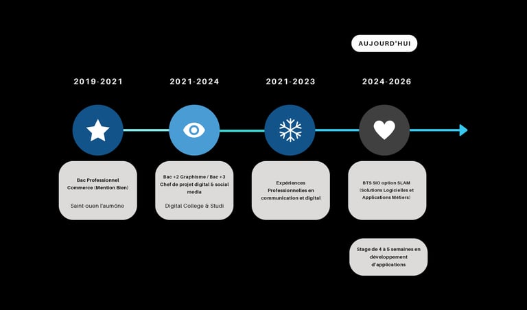 Depuis mes débuts dans le domaine de la communication digitale jusqu'à ma spécialisation en développement logiciel.